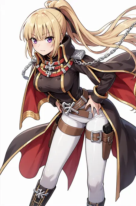 prompt: rebelRO, 긴 소매, 검은 코트, 높은 칼라, 망토 소매, 체인, 어깨장식, 아기유레트, 흰색 타이트한 바지, 벨트, 허벅지 스트랩, 총집, 허리 망토, 하이힐, 검은 끈 신발 무릎 부츠