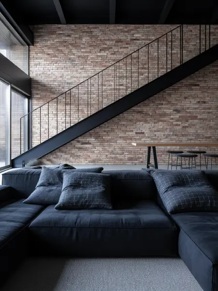 WD、スタイリッシュなリビングルーム。ダークグレーのセクショナルソファにふっくらとしたクッションが並び、快適な座り心地を提供している。空間はレトロな煉瓦の壁とモダンな黒色金属製の階段がアクセントとなり、工業風の雰囲気を強調している。背景には木製のダイニングテーブルとチェアが配置され、ソファに焦点を合わせるためややぼかされている。部屋は大きな窓から差し込む自然光に照らされ、全体的な雰囲気を高めている。被写界深度:手前を鮮明に、背景をソフトにぼかす。