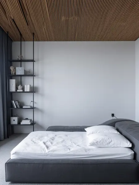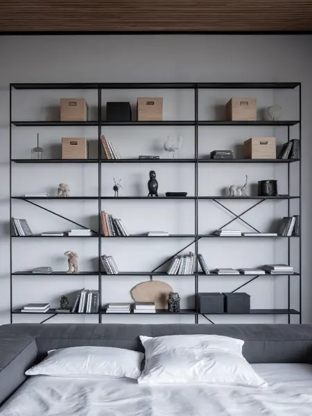 WD、スリムな黒色金属製のシェルフユニットが並び、整然と収納ボックスや装飾品が配置されたモダンなミニマリストな寝室。部屋には白いクッションが並ぶ柔らかなグレーのソファが設置され、快適さを加えている。背景はややぼかされ、整然としたシェルフを際立たせ、手前に焦点を集める被写界深度を形成している。コンテンポラリーなインテリアに最適な、機能性とスタイリッシュな美意識を融合させたデザイン。