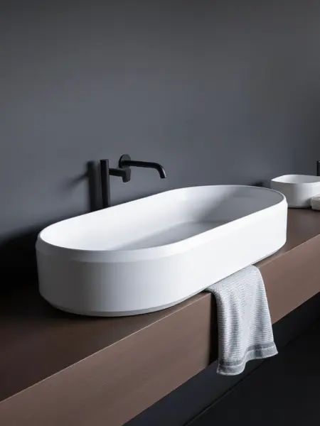 WD、ミニマリストなデザインとモノトーンのカラーパレットを特徴とするスタイリッシュなバスルーム。中央には黒いフレームの長方形の鏡が置かれ、モダンなシンクとベンチと調和している。軽い木で作られたベンチには2段の収納棚があり、それぞれ茶色の薬局瓶と小さな観葉植物が置かれている。ホワイトセラミックのバスタブが清潔感を与える。タオルはシンプルな黒いフックに丁寧に掛けられている。被写界深度は浅く、背景を微妙にぼかし、ベンチとシンクを際立たせている。コンテンポラリーな住宅に最適。