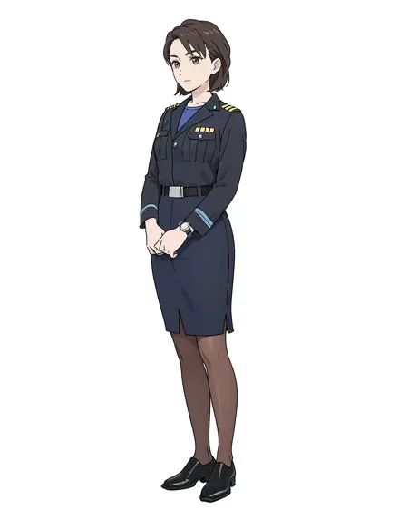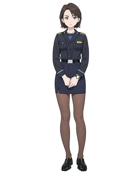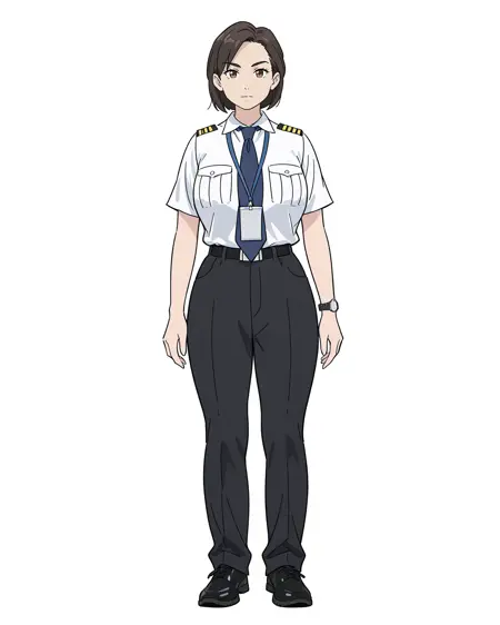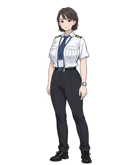女性船长,白色T恤和黑色内裤,独自一人,手表,腕表,长裤,衬衫,白色背景,黑色鞋履,全身,简单背景,黑色长裤,1个女孩,胸袋,白色衬衫,制服,棕色眼睛,领带,口袋,棕色头发,短袖,衬衫塞进裤子里,站立,腰带,蓝色领带,看着观众,短发,鞋子,闭嘴,手臂贴在身体两侧,巨乳,曲线玲珑,