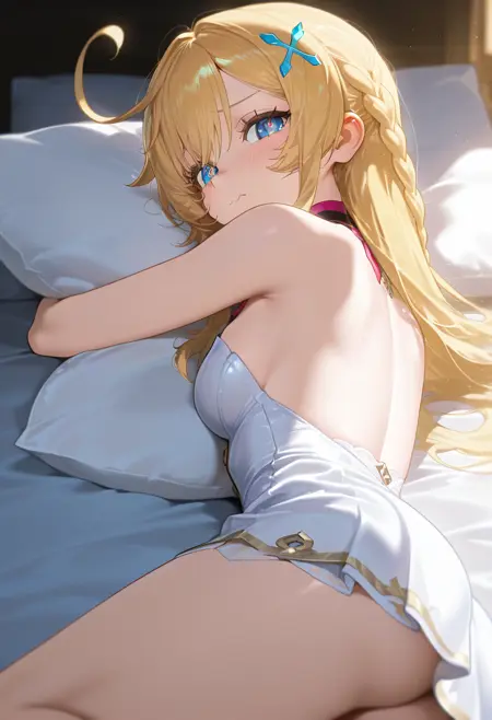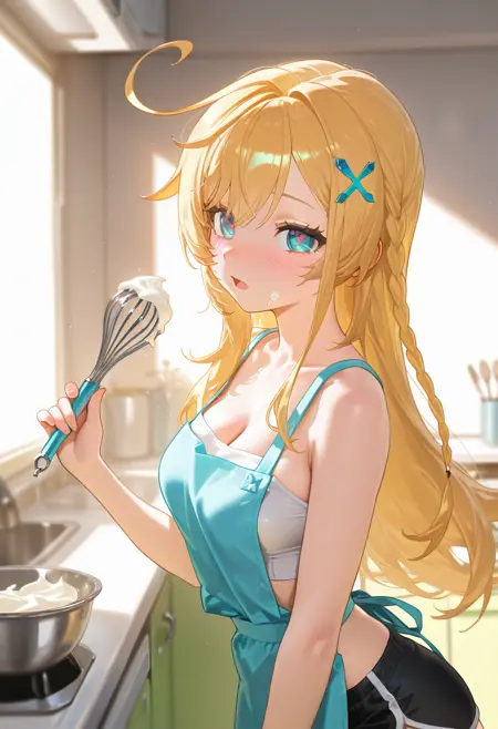 그녀의 외모 태그: 1girl, solo, long hair, blue eyes, medium breasts, blonde hair, ahoge, braid, x hair ornament, cross hair ornament, pink pupils,