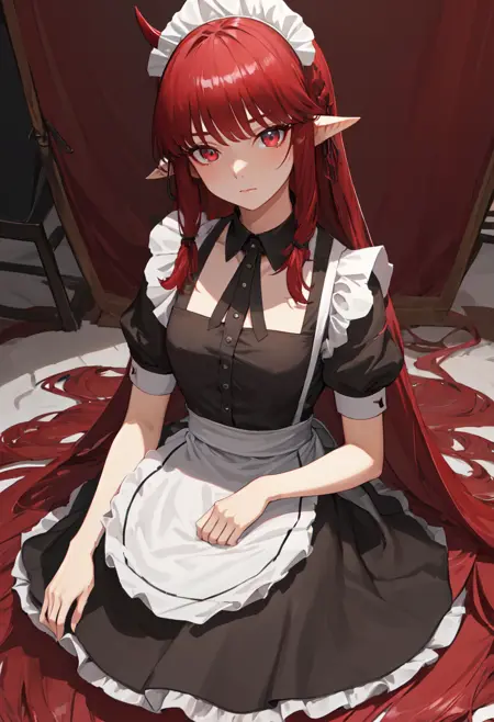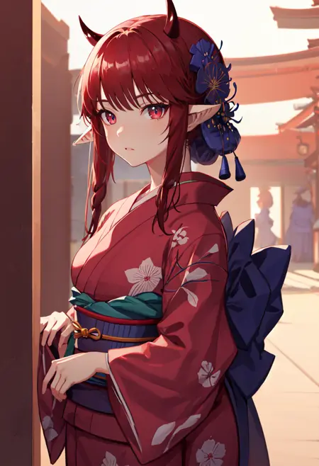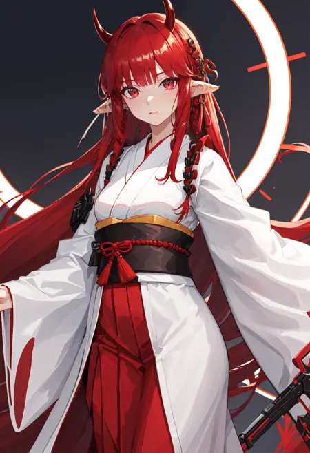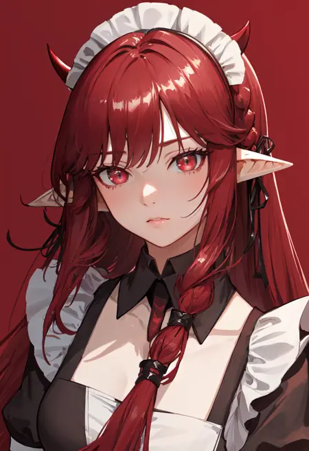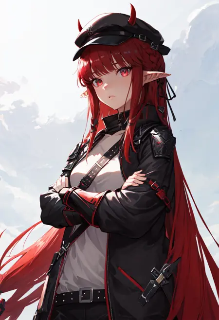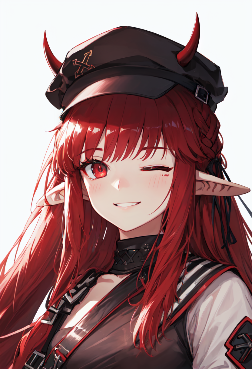 - The pruned character tags are long hair, pointy ears, red hair, horns, red eyes, hat, very long hair, black headwear, horns through headwear, braid, hair ornament, demon horns, cabbie hat, breasts. You can add them into prompts when core features (e.g. hair color) of character is not so stable.