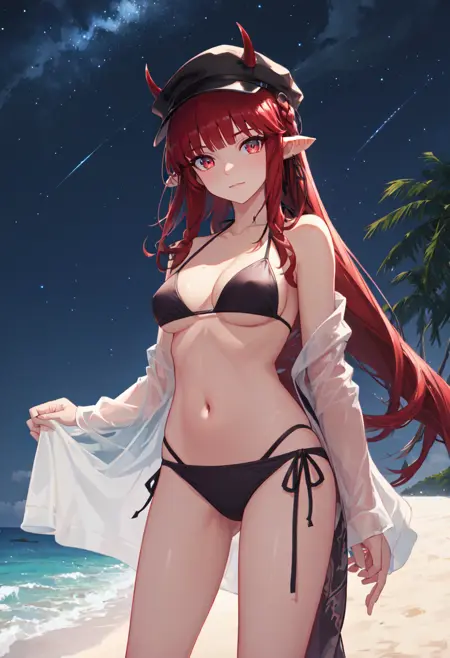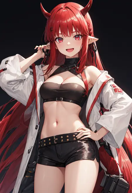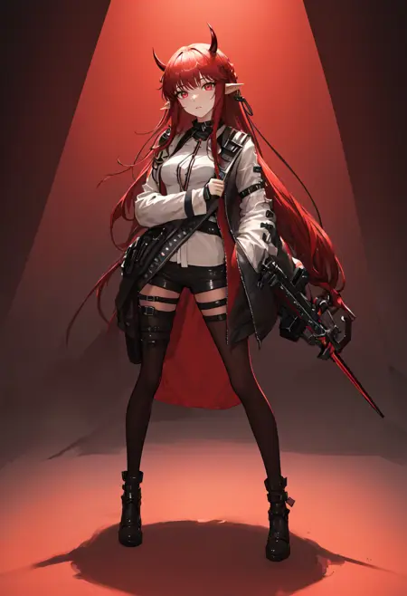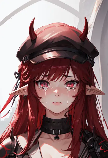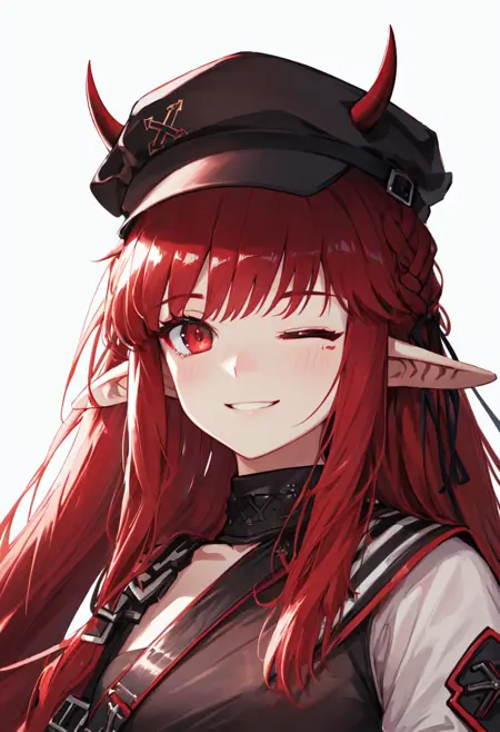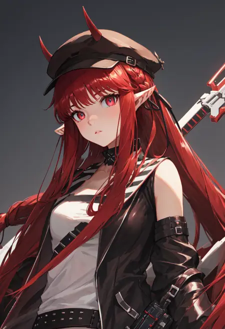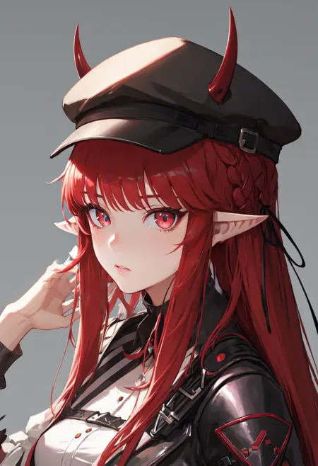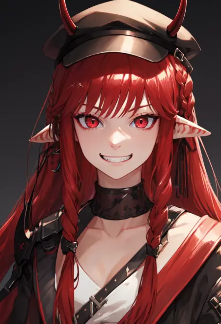 トリガーワードはvigna_arknights、削減されたタグはlong_hair, pointy_ears, red_hair, horns, red_eyes, hat, very_long_hair, black_headwear, horns_through_headwear, braid, hair_ornament, demon_horns, cabbie_hat, breastsです。ある特徴(例:髪の色)が安定しない場合、これらをプロンプトに追加できます。