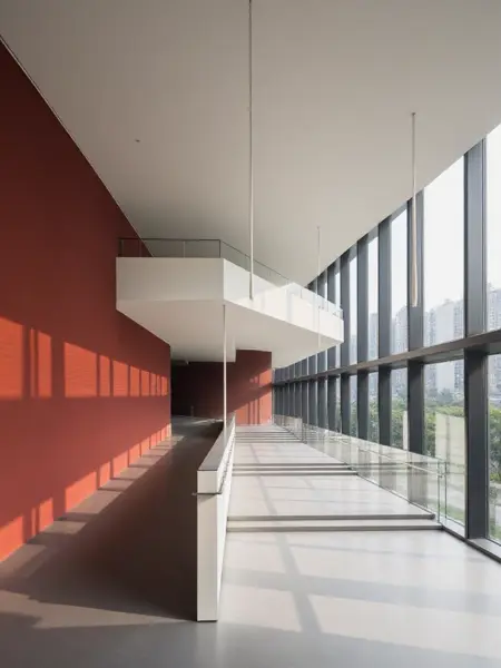 WD,这张照片呈现了一座现代极简主义建筑内部,拥有光滑的玻璃墙走廊。左侧墙壁涂成深红色,与洁白的天花板形成鲜明对比。右侧巨大的落地窗展现出高耸建筑群和湛蓝天空的城市景观。地面为抛光混凝土,反射着阳光。