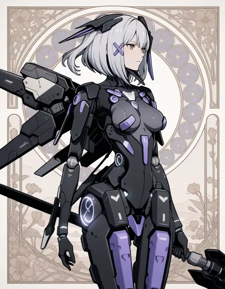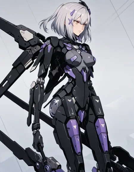 1girl,mai_pgr_rosetta_ll,mature_female,(aged_up:1.5),medium_breasts,brown_eyes,science_fiction, mecha_musume, medium_hair, grey_hair, mechanical_parts, headgear, hair_ornament, mechanical_arms, mechanical_legs, mechanical_wings, holding_weapon,sword