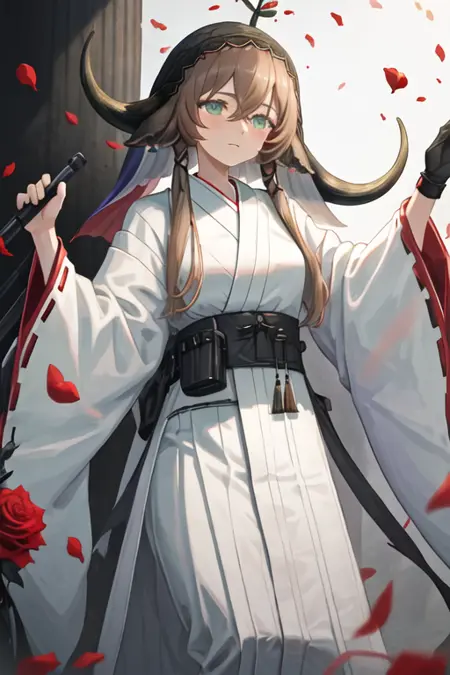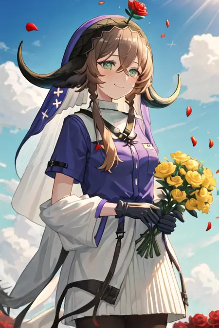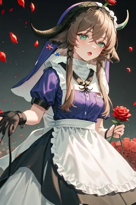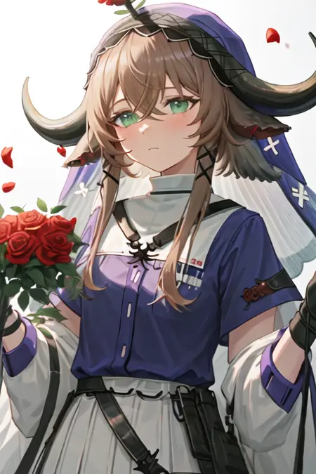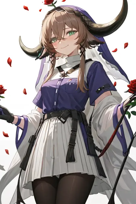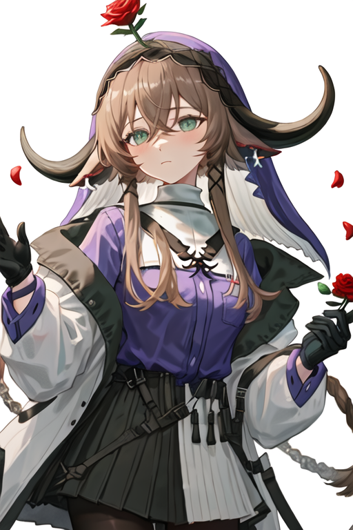 The trigger word is pallas_arknights, and the pruned tags are brown_hair, horns, animal_ears, cow_horns, cow_ears, green_eyes, cow_girl, hair_between_eyes, flower_on_head, long_hair, sidelocks. When some features (e.g. hair color) are not so stable at some times, you can add these them into your prompt.