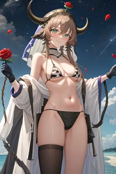 - The pruned character tags are brown hair, horns, animal ears, cow horns, cow ears, green eyes, cow girl, hair between eyes, flower on head, long hair, sidelocks. You can add them into prompts when core features (e.g. hair color) of character is not so stable.