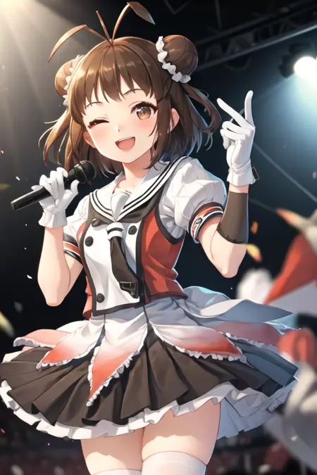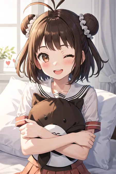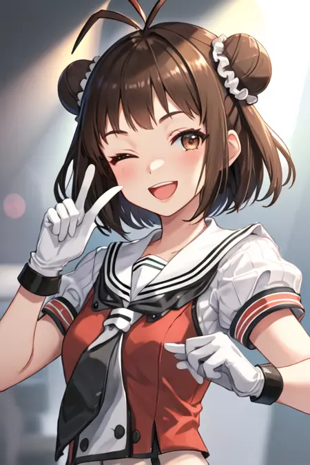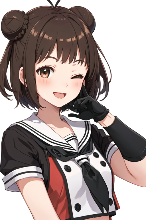 触发词为 naka_kantaicollection,推荐标签为:best quality, masterpiece, highres, solo, {naka_kantaicollection:1.15}, double_bun, hair_bun, brown_hair, short_hair, antenna_hair, brown_eyes, smile, serafuku, open_mouth, one_eye_closed。