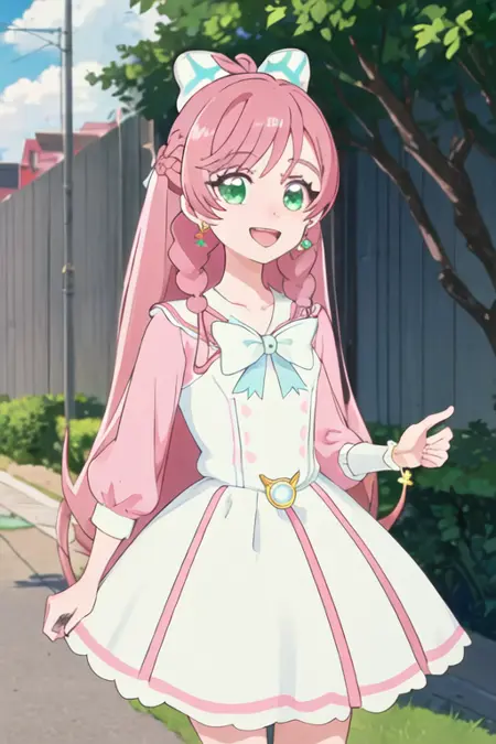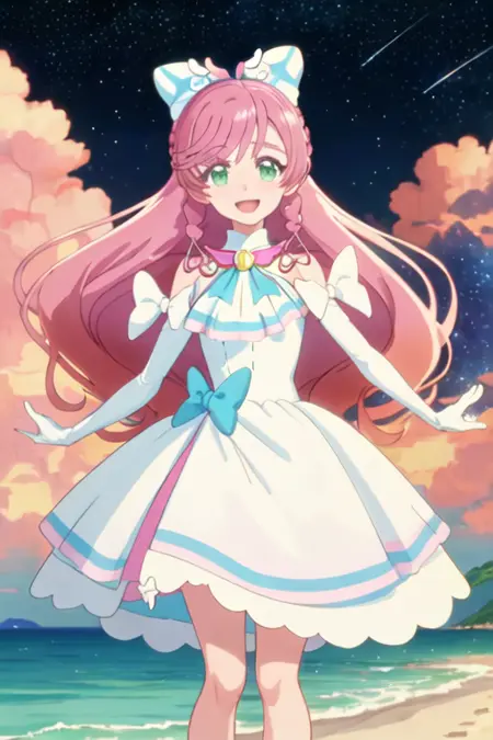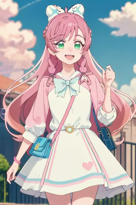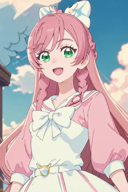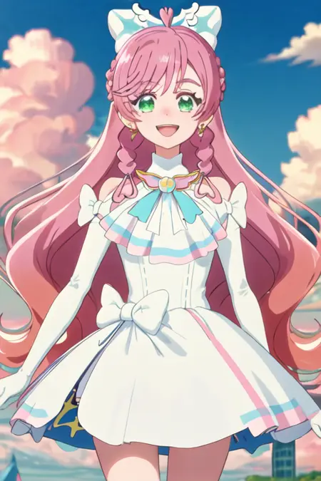 触发词为 cure_prism_hirogaruskyprecure,推荐标签为:best quality, masterpiece, highres, solo, {cure_prism_hirogaruskyprecure:1.15}, long_hair, green_eyes, pink_hair, bow, open_mouth, bangs, smile, white_bow。