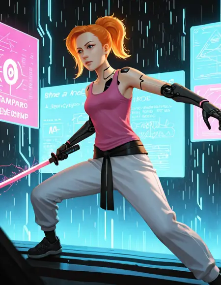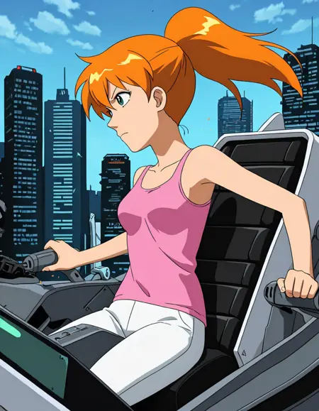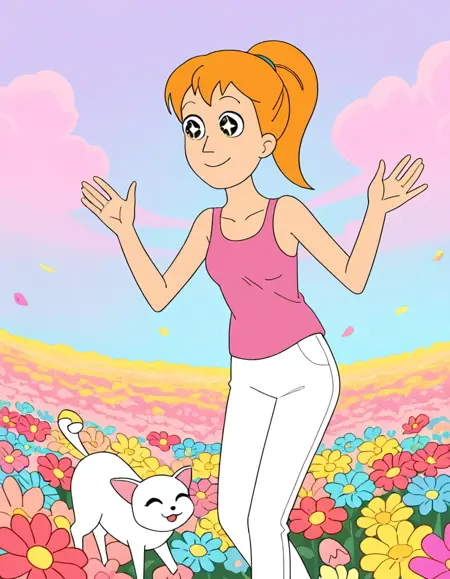 orange hairponytail(다른 헤어스타일을 지정하지 않는 경우 매우 권장)pink tank topwhite pants
