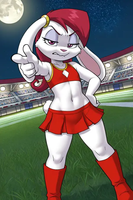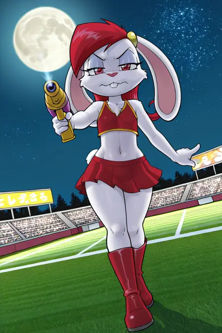 buck teeth, red skirt, red high top boots with yellow trim, red crop top shirt,