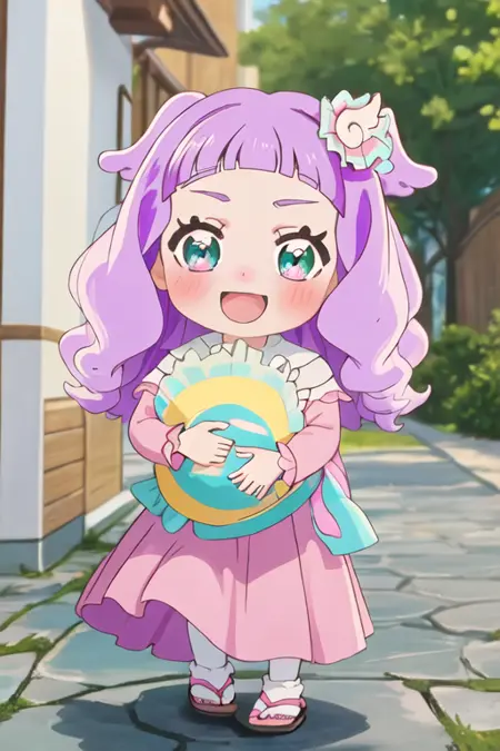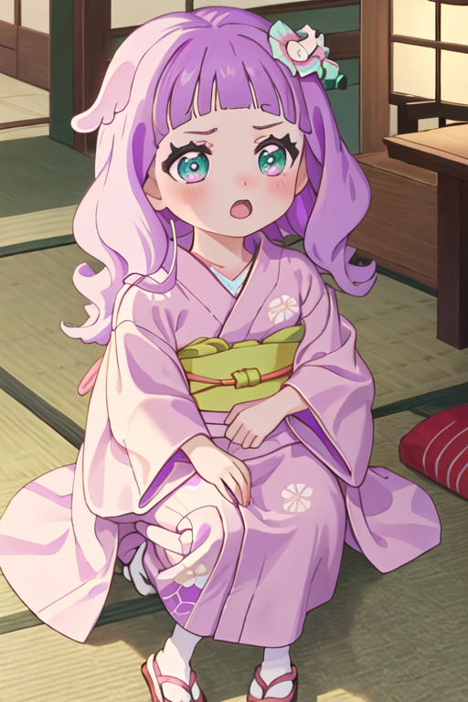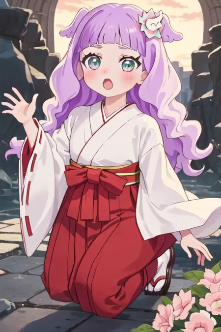 The trigger word is eruchiyan_hirogaruskyprecure, and the recommended tags are best quality, masterpiece, highres, solo, {eruchiyan_hirogaruskyprecure:1.15}, purple_hair, bangs, hair_ornament, green_eyes, blunt_bangs, open_mouth, blush, pink_hair, long_hair, multiple_girls, 2girls, hair_flower.