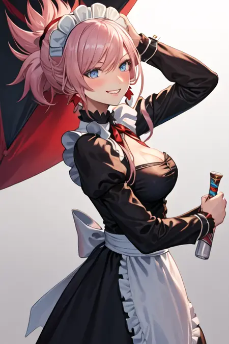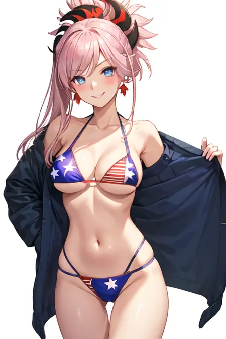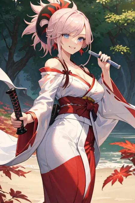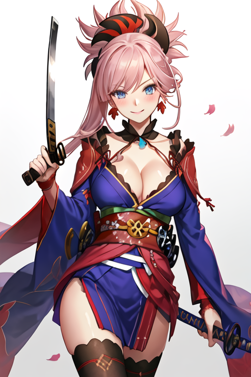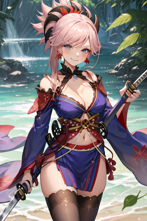 The trigger word is miyamoto_musashi_fgo, and the pruned tags are pink_hair, blue_eyes, breasts, ponytail, long_hair, earrings, hair_ornament, large_breasts, bangs, asymmetrical_hair. When some features (e.g. hair color) are not so stable at some times, you can add these them into your prompt.