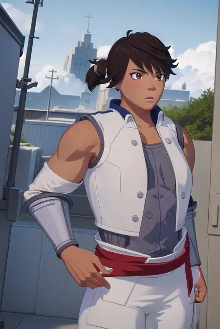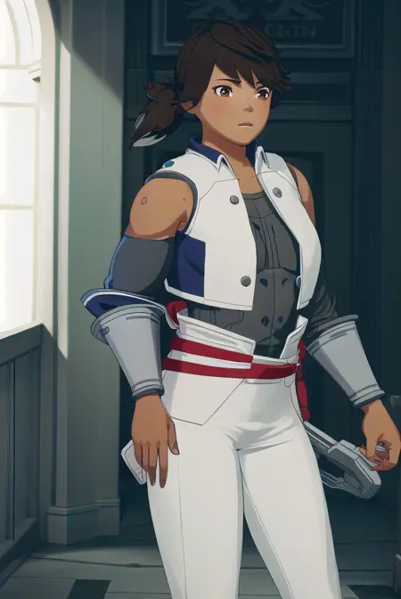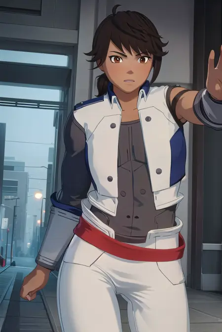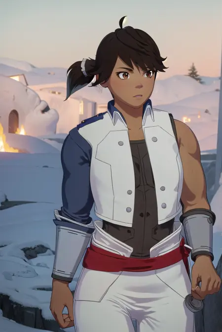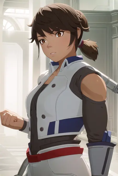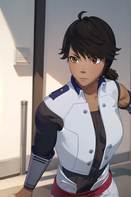 elm ederne, brown hair, (brown eyes:1.5), ponytail, dark skin, short ponytail,