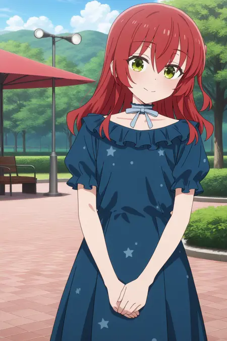 aaikuyo, green eyes, red hair,  one side up, ikuyoc1, blue choker, frilled choker, blue dress, frilled dress, puffy short sleeves, star print, anime coloring,