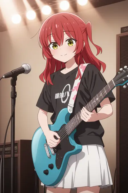 aaikuyo, green eyes, red hair, one side up, ikuyoband, black shirt, short sleeves, clothes writing, white skirt, pleated skirt, anime coloring,