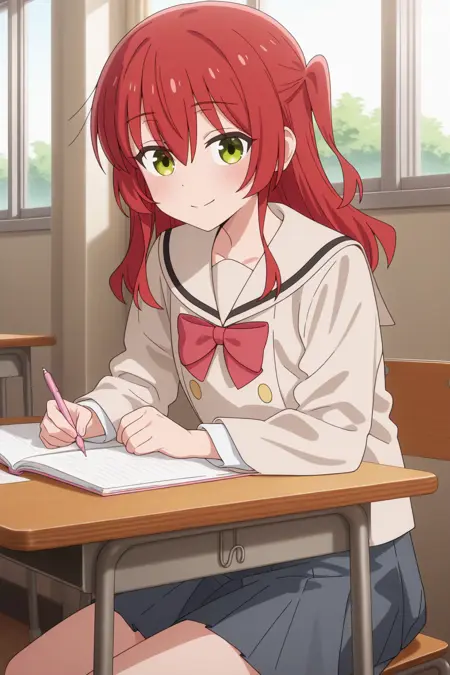 aaikuyo, green eyes, red hair,  one side up, ikuyoschool, brown sailor collar, red bowtie, brown shirt, long sleeves, grey skirt, pleated skirt, anime coloring,