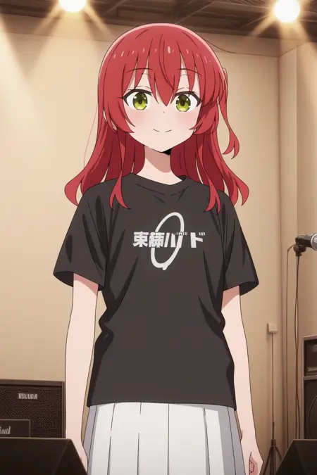 aaikuyo, green eyes, red hair,  one side up, ikuyoband, black shirt, short sleeves, clothes writing, white skirt, pleated skirt, anime coloring,