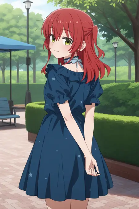 aaikuyo, green eyes, red hair, one side up, ikuyoc1, blue choker, frilled choker, blue dress, frilled dress, puffy short sleeves, star print, anime coloring,