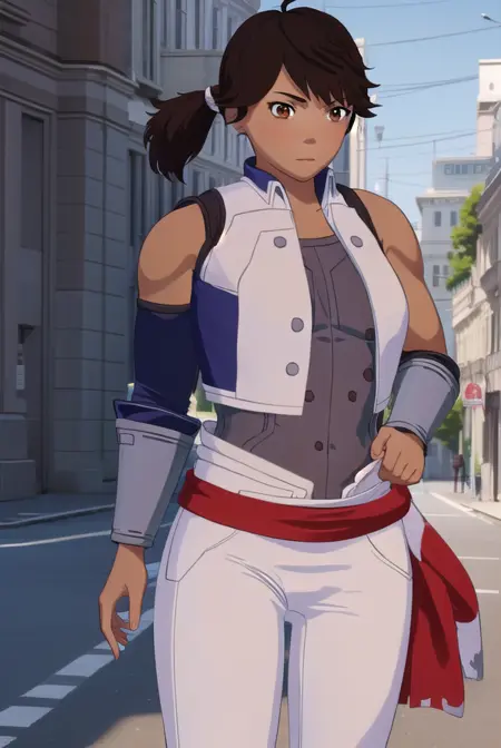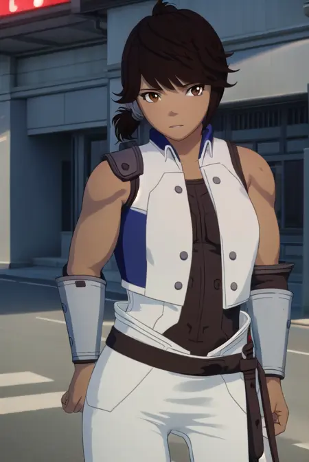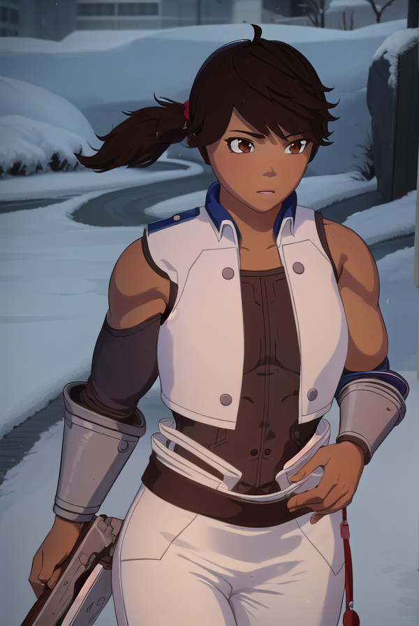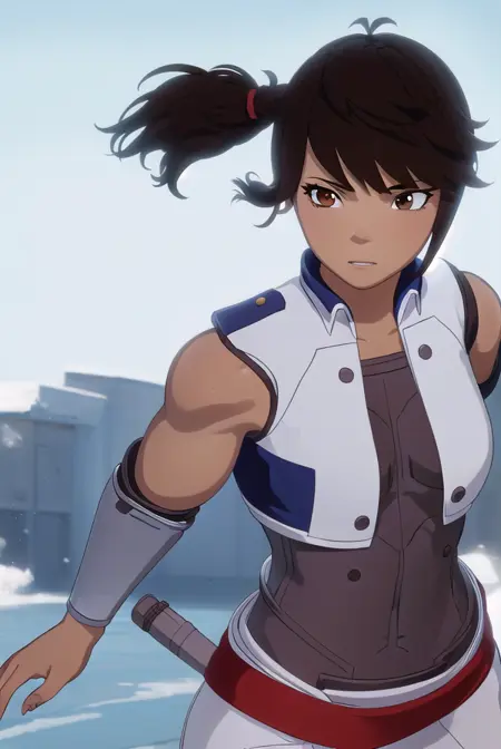 elm ederne, brown hair, (brown eyes:1.5), ponytail, dark skin, short ponytail,