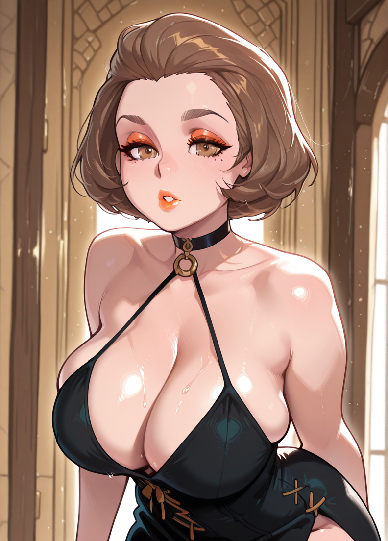 manuelaxd, 1girl, brown eyes, lips, mole under eye, short hair, brown hair, choker, makeup, lipstick, hair slicked back,