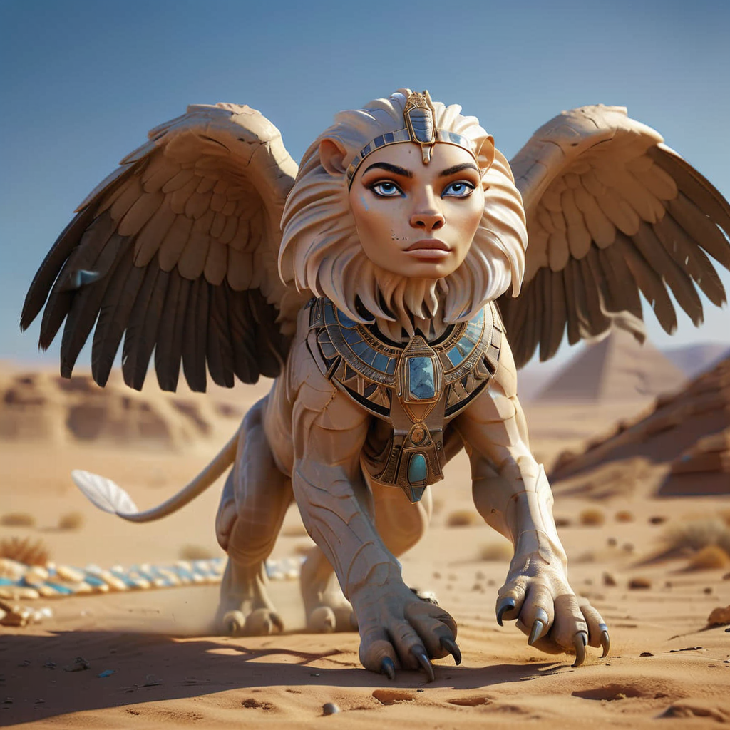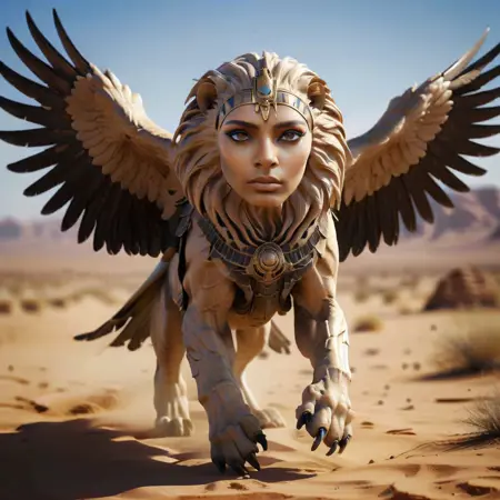 all fours, black eyes, black fur, black wings, blue eyes, blurry, blurry background, brown eyes, brown fur, claws, closed mouth, dark skin, dark-skinned female, dark-skinned male, earrings, feathered wings, feathers, flying, full body, headband, headdress, horns, humanoid face, jewelry, lion body, lips, long hair, looking at viewer, multicolored hair, no humans, realistic, rpgsphinx, solo, white fur, wings