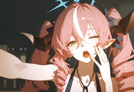 タグ: 悪魔の角、イヤリング、緑の目、眉間の髪、長い髪、片方の目 under に一つのほくろ、ピンクの髪、とがった耳、