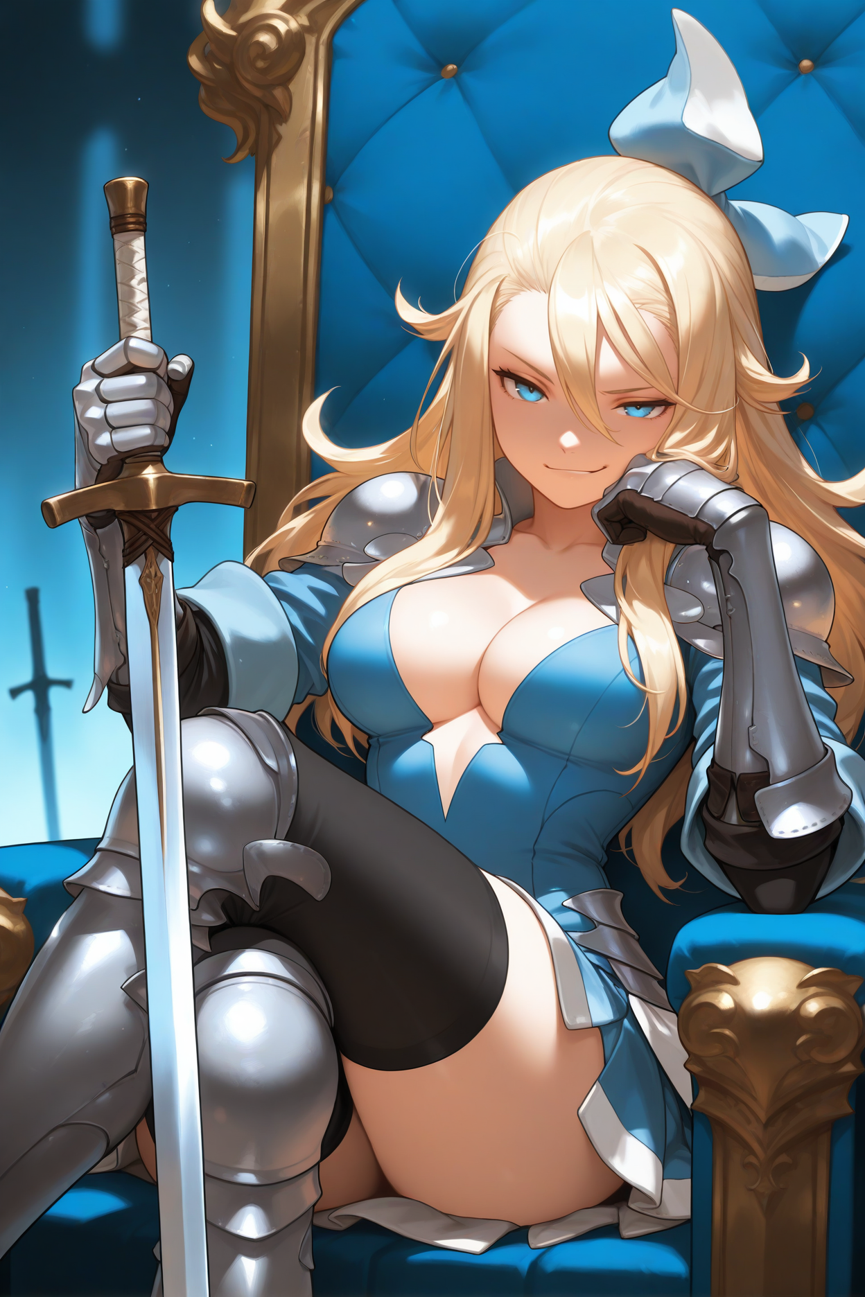 • 为她的《勇气默示录2》造型添加:“bsedl, 金发, 长发, 蓝眼, 发丝垂于眼前, 发带, 蓝色发带, 白色发带, 肩部护甲, 暴露胸部, 蓝色连衣裙, 护甲连衣裙, 短裙, 蓝色袖子, 袖子卷起, 手套, 黑色过膝袜, 护甲靴