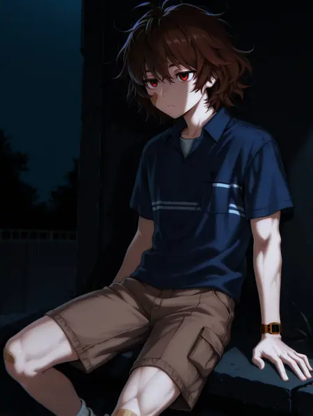 衣装プロンプト:shirt, bandaid, blue shirt, bandaid on cheek, short sleeves, collared shirt, shorts, brown shorts, bandaid on leg, watch, wristwatch, white socks, shoes, sneakers