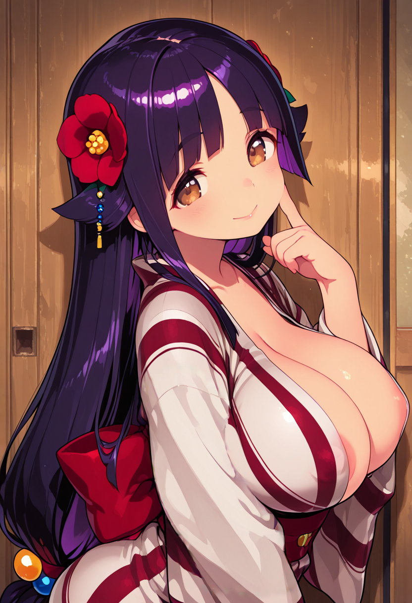 トリガー:harukawa_tomoe、紫髪、低く結んだロングヘア、ヘアボブル、ブンテング、外側にカールしたサイドロックス、茶色の目、たれ目、唇、