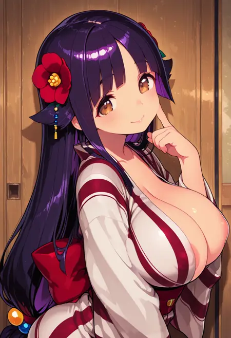 Trigger : harukawa_tomoe, purple hair, low_tied_long_hair, hair_bobble, blunt_bangs, flipped_sidelocks, brown eyes, tareme, lips,