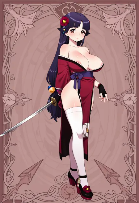 Outfit 2 : camellia_hair_ornaments, red_short_kimono, side_slit, purple_sash, black_fingerless_gloves, white_thighhigh, shoulder slip, cleavage, bare shoulders, long sleeves, black_shoes, red_wedge_heels, katana,