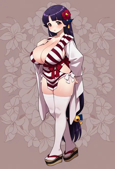 Outfit 1 : camellia_hair_ornament,striped_short_kimono, white_long_sleeves, cleavage, red_sash, side_cutout, side_tied_kimono, white_thighhigh, okobo, wedge_heels,