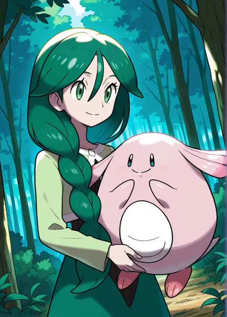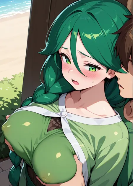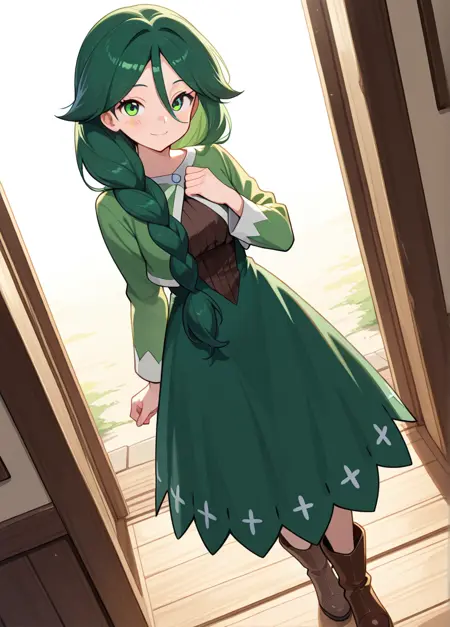 cherylxd, 1girl, green hair, long hair, green eyes, single braid, hair over shoulder, hair between eyes, bangs, eyelashes,