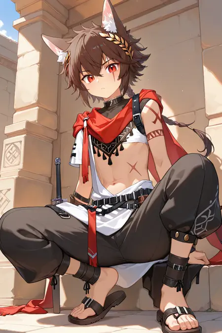 tyr, red_eyes, brown_hair, animal_ears, wolf_ears, scar_on_face, braid, red_scarf, laurel crown, scar across eye, animal_ear_fluff, pants, sandals,