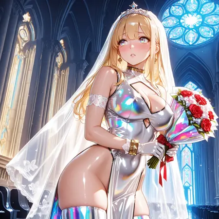 Invoke with latex, zipper, black trim, shiny, triangle cleavage cutout, thighhighs, choker, covered nipples, skirt, sleeveless, bare arms, gloves, leather cuffs