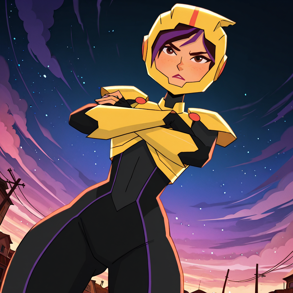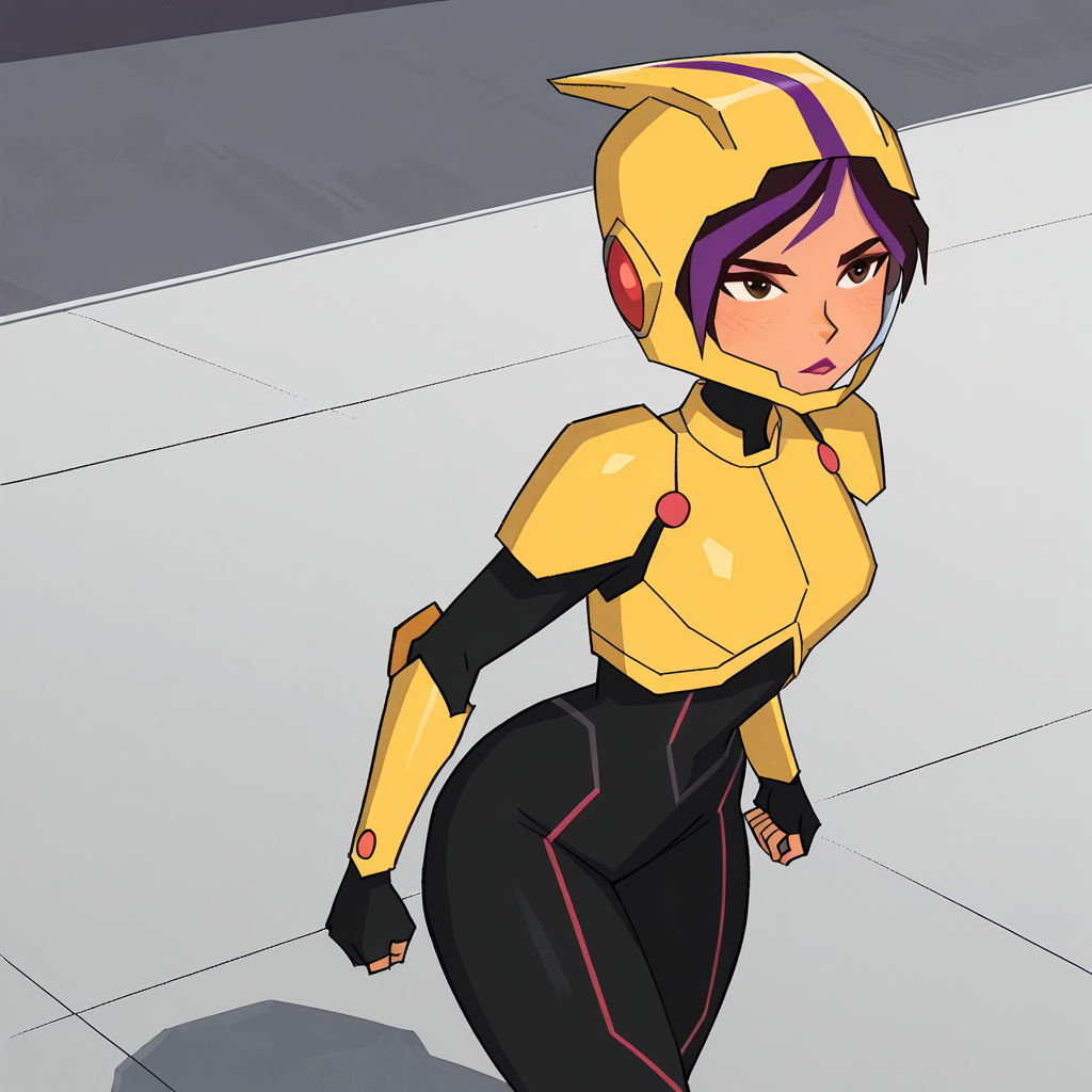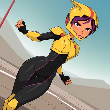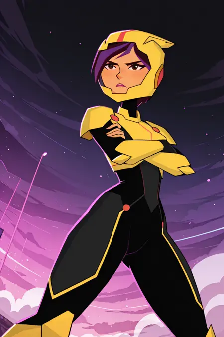 SpeedQueen, 1소녀, 여자, 하얀 피부, 검은 머리, 보라색 머리 스트라이프, 검은 눈썹, 진한 갈색 머리, 분홍빛 립스틱, 검은 바디수트, 노란 갑옷, 헬멧, 보라-자홍색 톤, 검은 손가락 없는 장갑,
