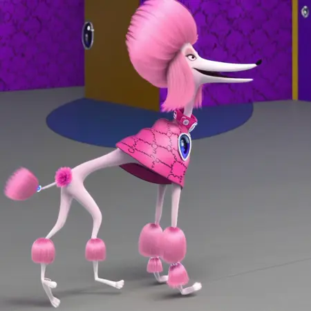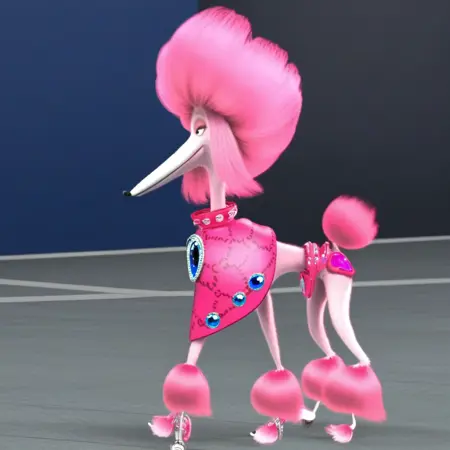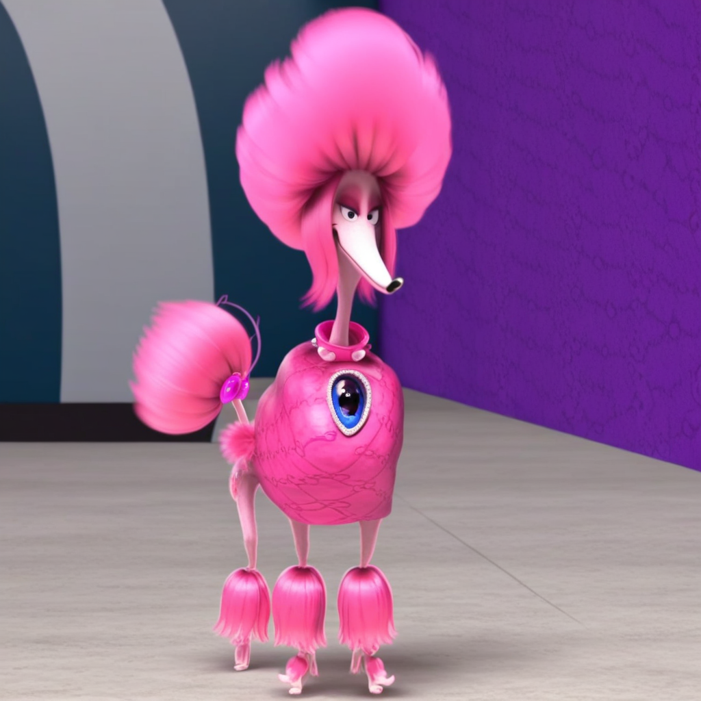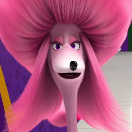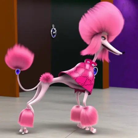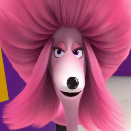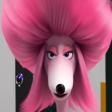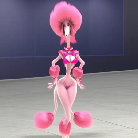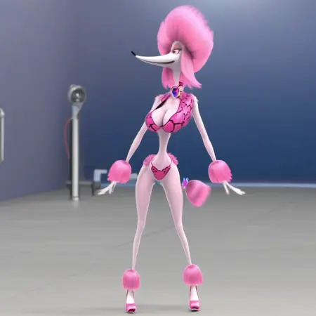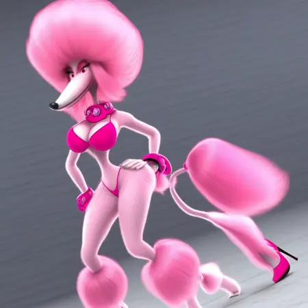 Shantrelle, 1girl, solo, poodle, poodle girl, pink fur, pink body, hot pink hair, poodle tail, cuffs, female, makeup,