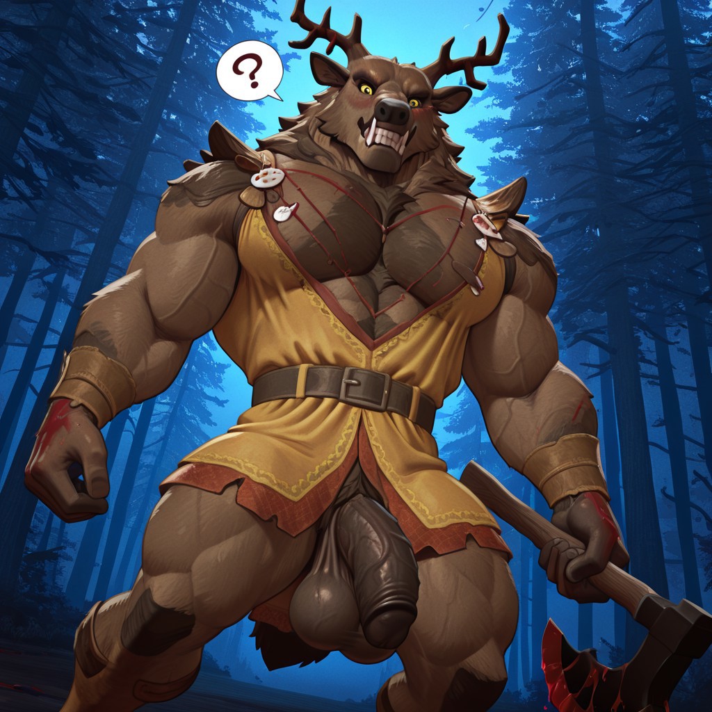 Were-Elk, brown fur, teeth, antlers, ornaments, axe