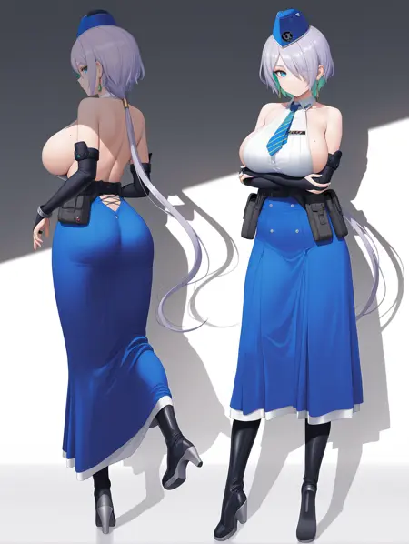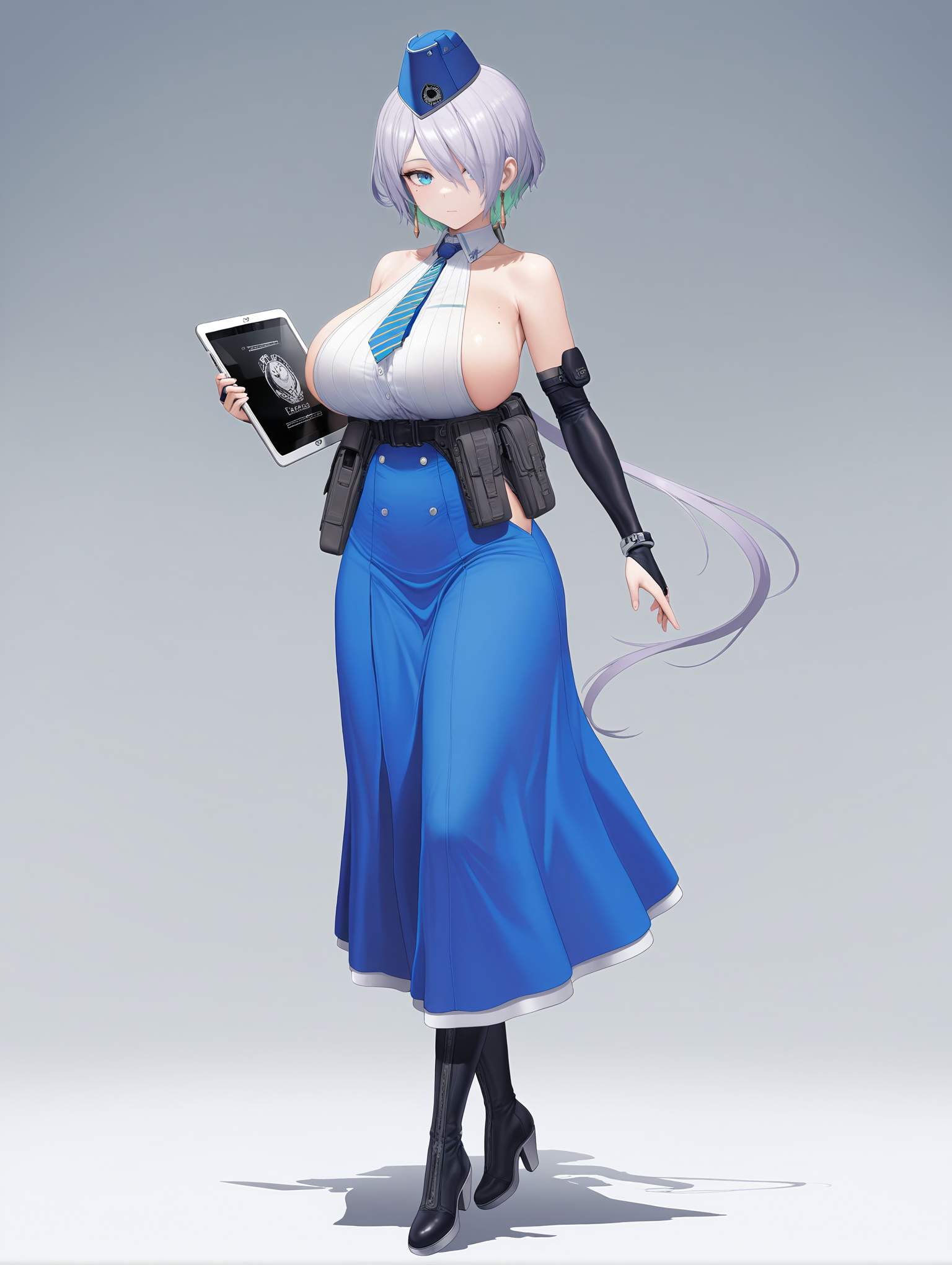 IL_브리드, 긴 치마, 옆이 열린 셔츠, 파란 넥타이, 치마, 신부 장갑, 파란 머리 장식, 옆가슴, 주머니, 벨트 주머니, 허리 높은 치마, 파란 치마, 파란 군모, 부츠, 넥타이, 셔츠, 어깨 노출, 모자, 칼라 있는 셔츠, 소매 없음, 흰색 셔츠, 검은 신발, 줄무늬 넥타이, 소매 없는 셔츠, 가슴에 mole, 벨트, 하이힐 부츠, 장갑, collarbone, 무릎 부츠, 검은 벨트, 등이 열린 셔츠, 검은 신부 장갑, 파란 긴 치마