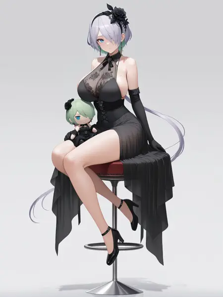IL_브리드, 1소녀, 혼자, 파란 눈, 매우 긴 머리, 회색 머리, 색상 내부 머리, 녹색 머리, 한쪽 눈 위의 머리, 낮게 묶인 긴 머리, 가슴, 거대한 가슴, 귀걸이, 달린 귀걸이, 보석