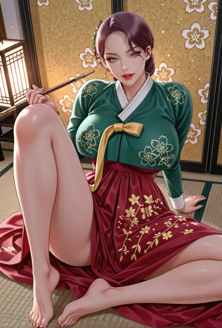 Character: 1girl, solo, Hwakyung, milf, purple_hair, hair bun, low bun, hair ornament, hairpin, floral hair ornament, wavy_hair, slightly_wavy_hair, loose_strand, hair_strands_over_face, hair strands over eye, hair_over_shoulder, long_eyelashes, silver_eyes, mole under eye, red lipstick, parted lips, wavy mouth, massive breasts, narrow waist, wide hips, huge thighs, huge ass,