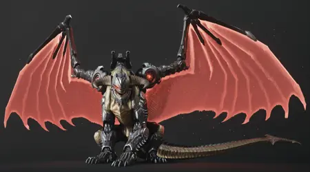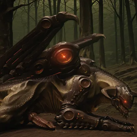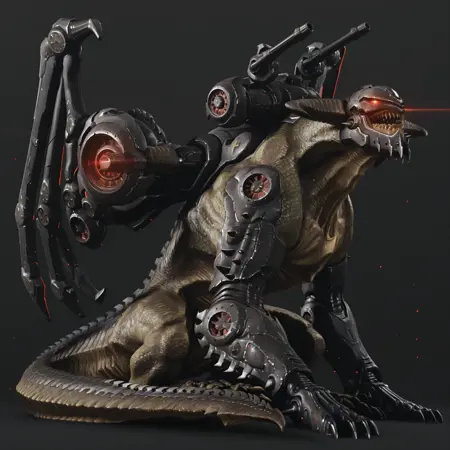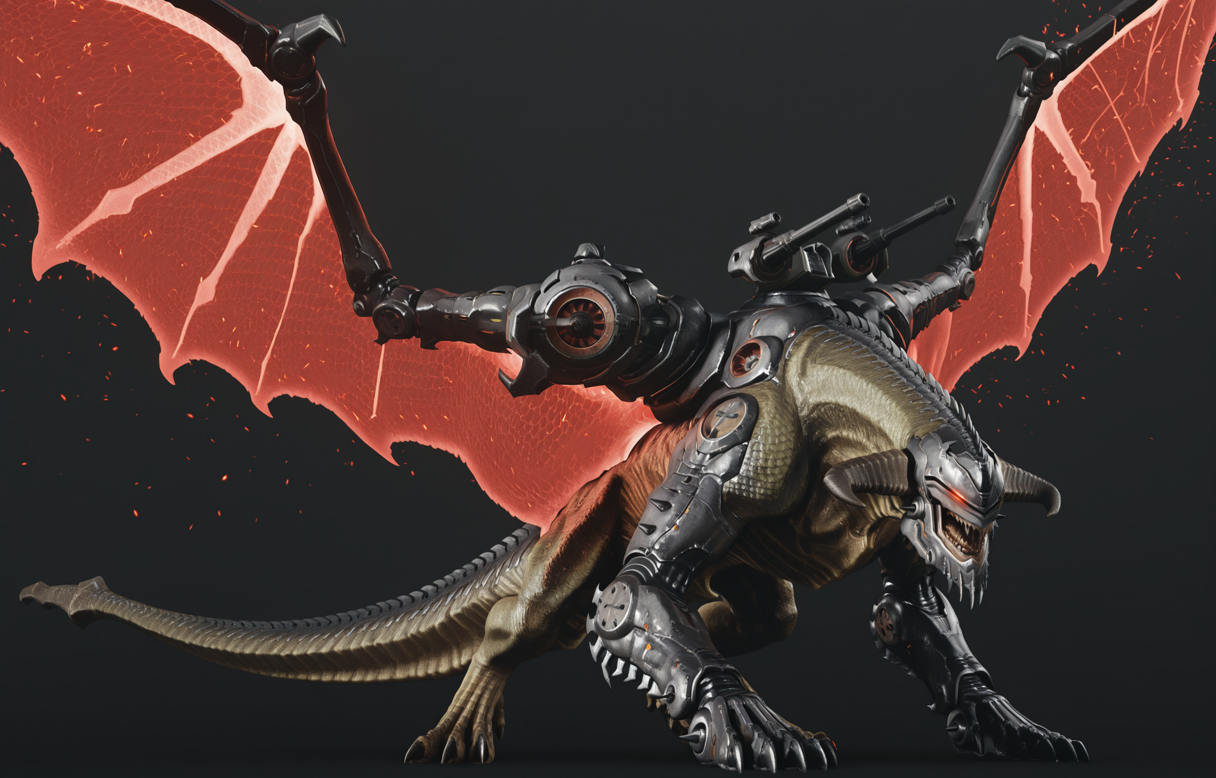 "serrat, 풍모, 드래곤, 단독, 뿔, 헬멧, 메카, 로봇, 빛나는 눈, 사이버네틱 팔, 근육질, 이빨, 날카로운 이빨, 포탑, 꼬리, 펼쳐진 날개"