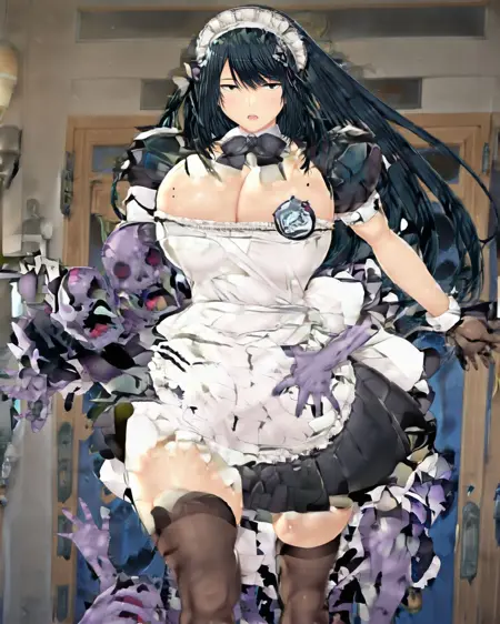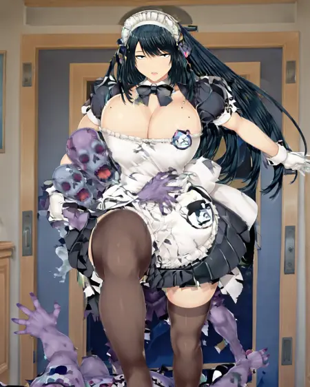 girl squatting and arched back to cross red line,FuyumiKirisaki,sanpaku,maid suit,1girl,monochrome,breasts,thighhighs,greyscale,long hair,censored,maid headdress,maid,spread legs,large breasts,skirt,squatting,