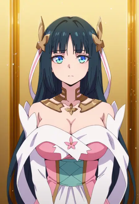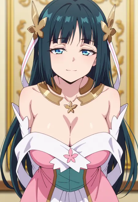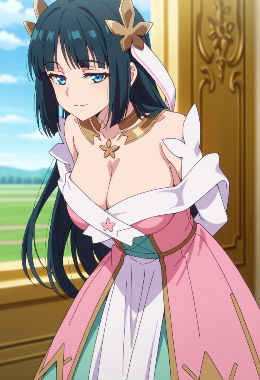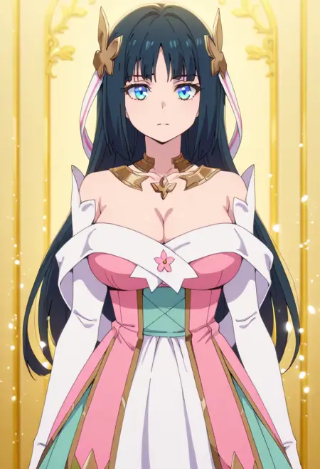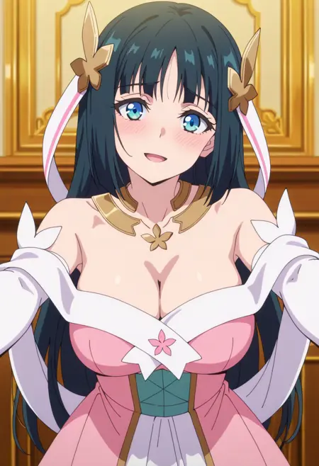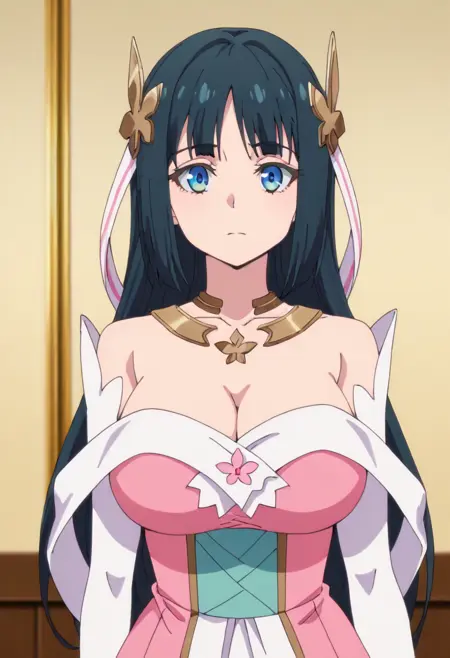 1girl,solo,long hair,black hair,hair between eyes,hair ornament,blue eyes,large breasts,cleavage