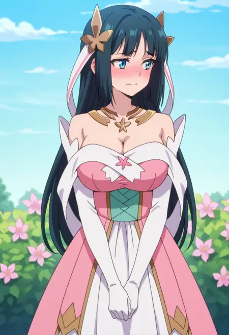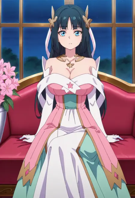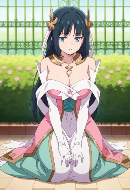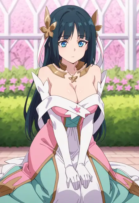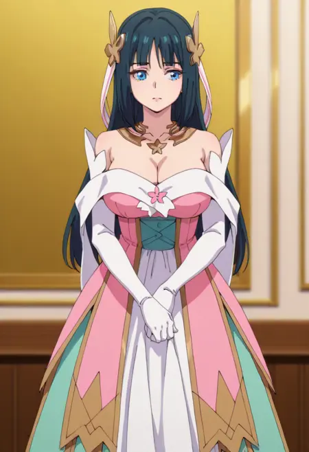strapless dress,off-shoulder dress,bare shoulders,long dress,multicolored dress,white dress,green dress,pink dress, layered dress, green sash, gold trim, pink flower, elbow gloves,white gloves,white shawl