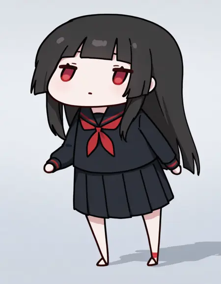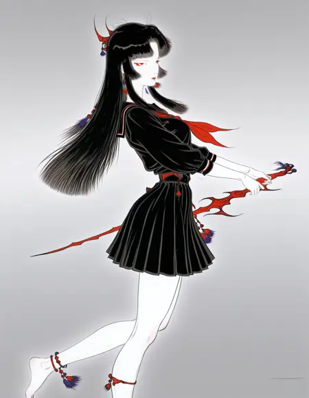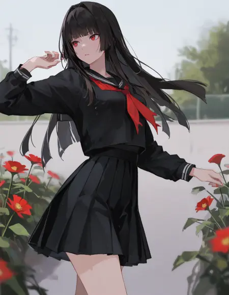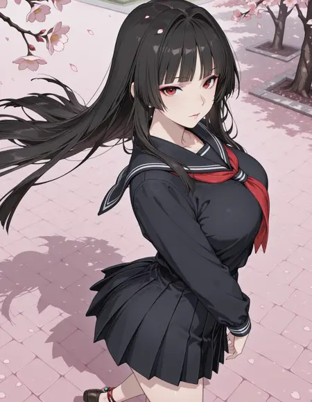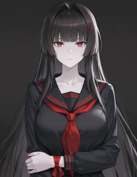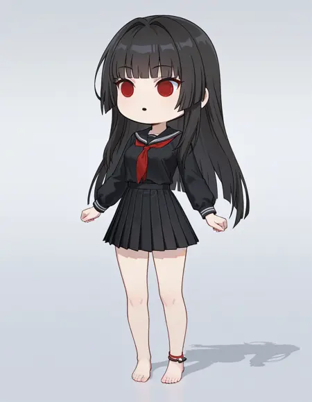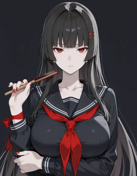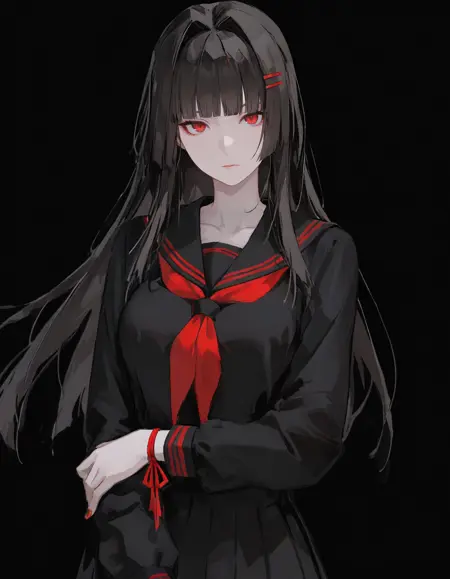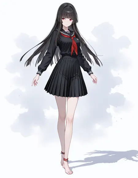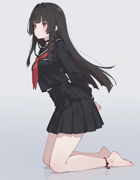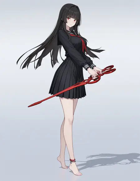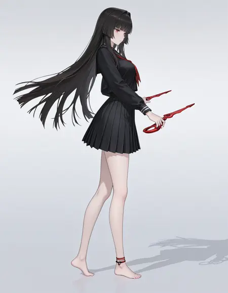 maipgrsaotomeyuka,1girl,mature_female,(age_up:1),long_hair,hime_cut,sidelocks,black_hair,red_eyes,black_serafuku,red neckerchief,pleated_skirt,black_skirt,barefoot,anklet,holding_scissors