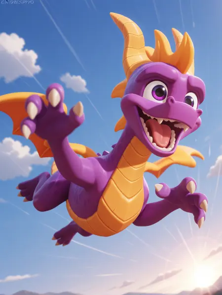 额外信息: 该LoRA基于4K游戏截图中的多种表情训练而成,因此不仅表情丰富,还学习了斯派罗的坐姿与飞行动画,以及他伸出舌头的图像。