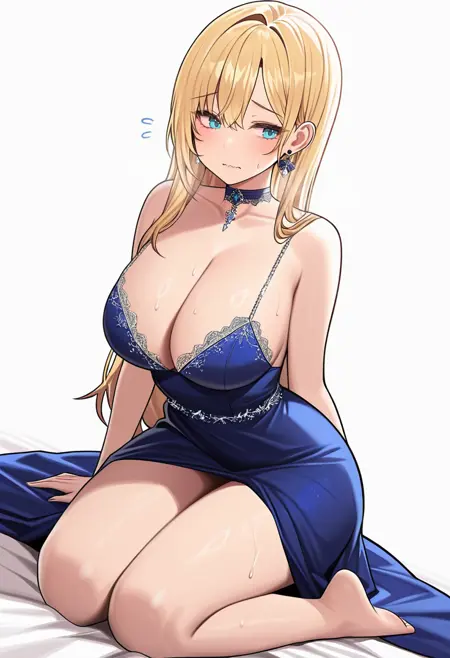 cleavage, earrings, blue dress, evening gown, choker, lace-trimmed dress,jewelry,